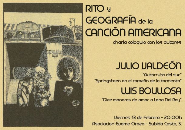 O venres día 13 de febreiro, ás 20:00 horas, os xornalistas e escritores Julio Valdeón e Luis Boullosa manterán unha conversa ao fío das súas últimas publicacións Autorruta del sur (EfeEme) e Darkness On the Edge of Town: Springsteen en el corazón de la tormenta (EfeEme) de Valdeón e Diez maneras de amar a Lana Del Rey (Liburuak) de Boullosa.