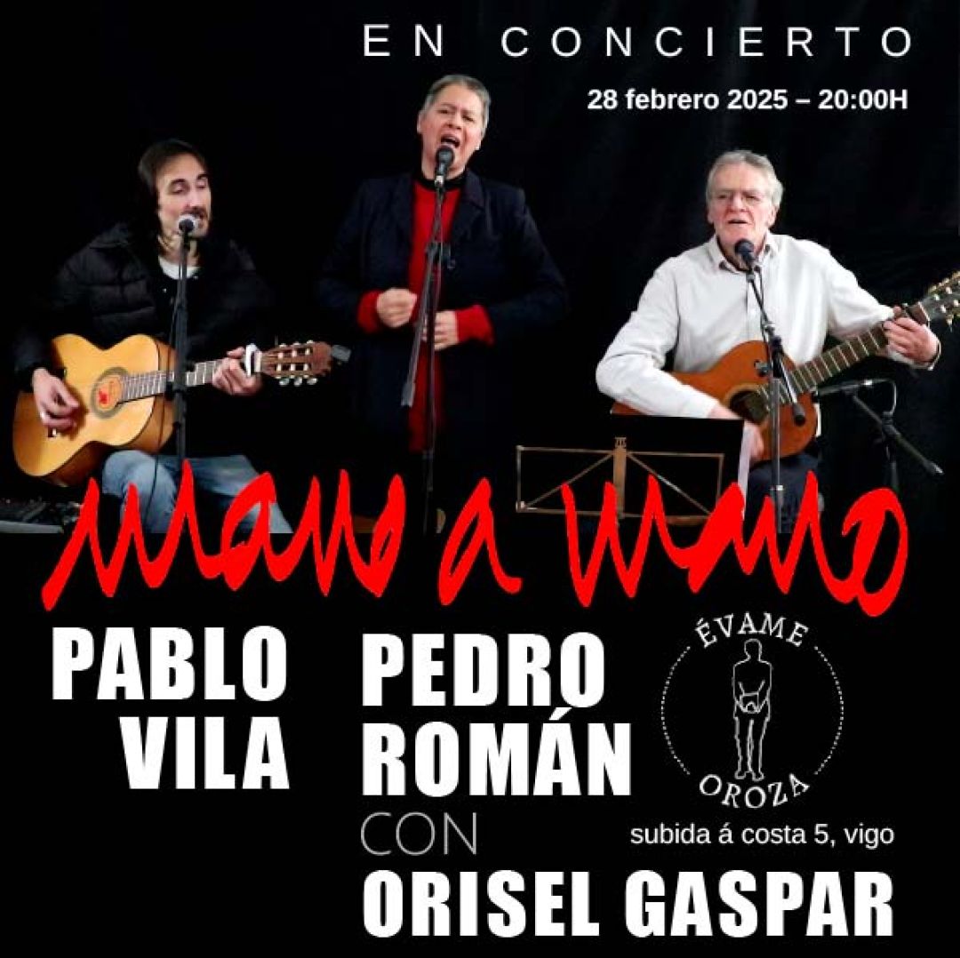 Pecharemos a semana, o venres 28 de febreiro (20:00 horas), con “Mano a mano”, un concerto de Pablo Vila e Pedro Román Company, en el que inician o seu percorrido a principios do século XIV co Arcipreste de Hita e culminan na obra de Nicolás Guillén. O venres, estarán acompañados por Orisel Gaspar en varios dos temas que configuran o concerto, do que son protagonistas once poetas de fala hispana. Os poemas, aos que ambos os cantautores puxéronlle música, convidan a unha exploración a través do tempo desde a mirada dos poetas seleccionados. Na última parte do concerto, inclúense composicións onde tanto a letra como a música son autoría de Pablo Vila e Pedro Román.