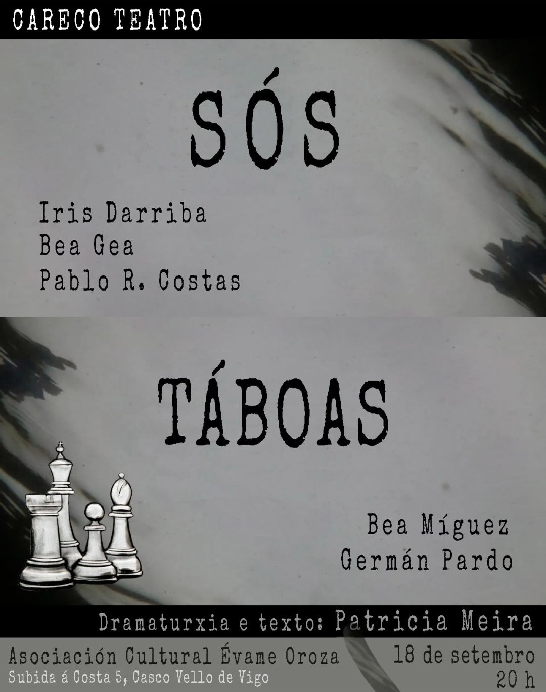 O xoves 18, ás 20:00 horas, con Careco Teatro, que nos traen dúas pequenas pezas de micro teatro: Sós e Táboas. A dramaturxia e os textos son da escritora Patricia Meira e o elenco está formado por Iris Darriba, Bea Gea, Pablo R. Costas Bea Míguez e Germán Pardo.