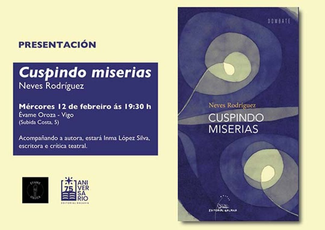Esta semana acollemos no local de Évame Oroza a presentación do primeiro libro da comunicadora e actriz Neves Rodríguez, quen co poemario Cuspindo miserias (Galaxia) inicia a súa andaina no mundo editorial despois dunha ben coñecida traxectoria como actriz e presentadora de televisión. O acto terá lugar o día 12 de febreiro ás 19:30 horas e nel participarán a autora, a quen acompañará da escritora Inma López Silva.