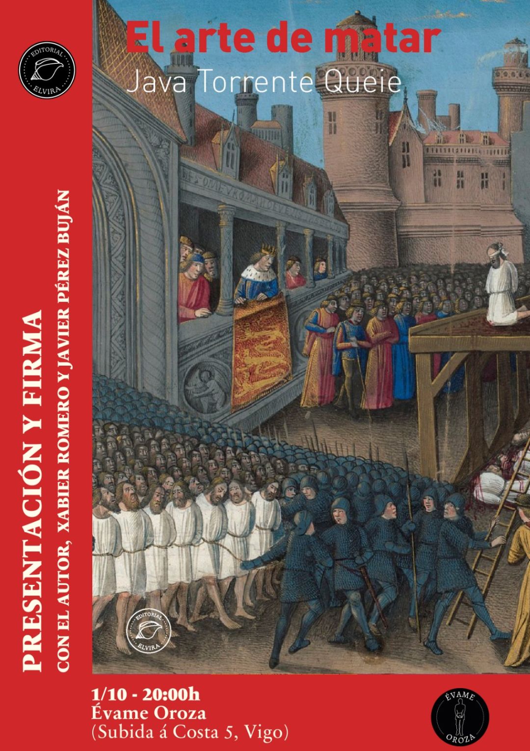 O mércores 1 de outubro, ás 20:00 horas, terá lugar a presentación do libro El arte de matar, de Java Torrente, editado por Elvira. No acto, o autor estará acompañado por Xabier Romero (Editorial Elvira) e Javier Pérez Buján (director artístico de la Fundación Laxeiro). A novela entretece feitos reais con feitos talvez reais, onde o lector convértese en testemuña (e presuntamente cómplice) de crimes perfectos.