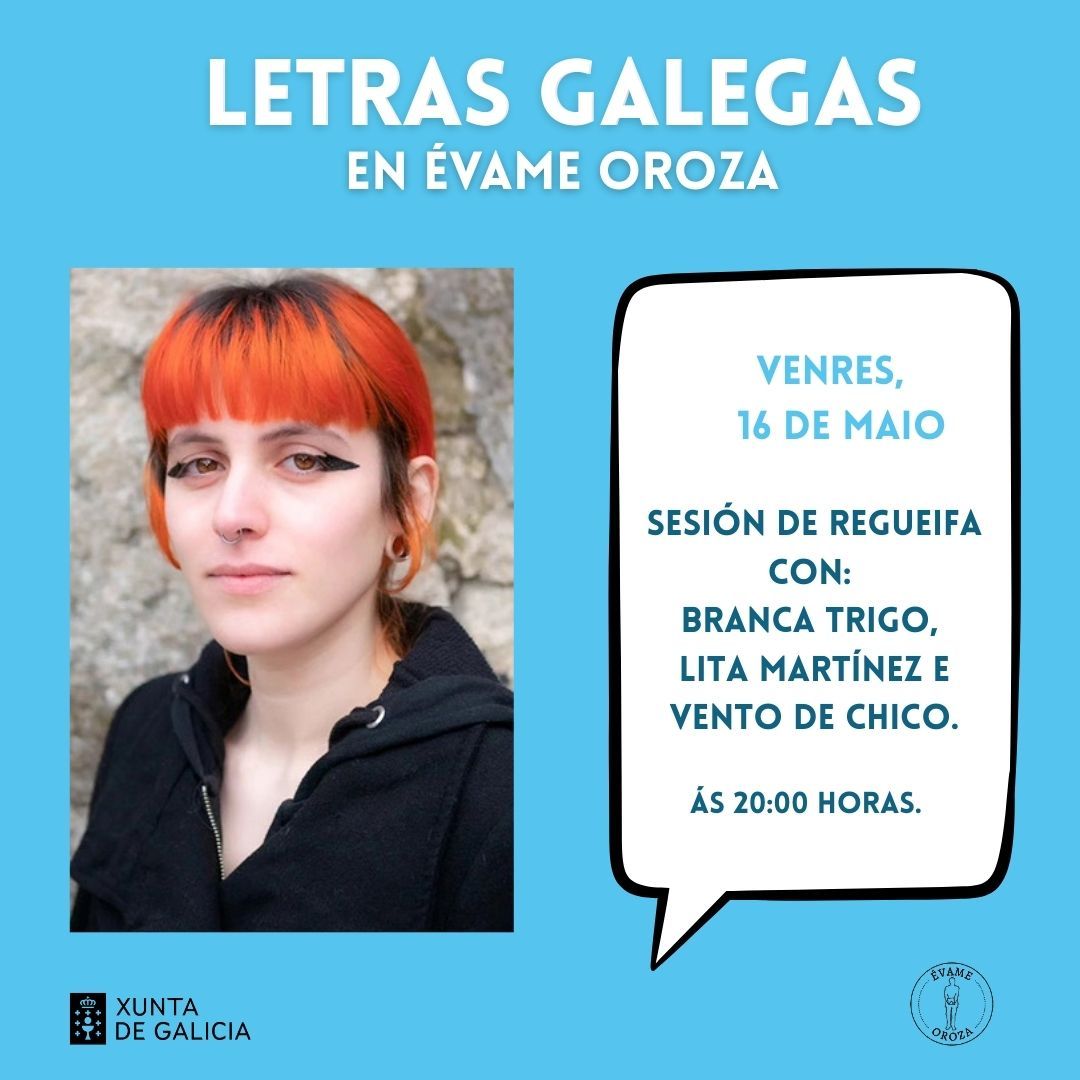 O venres día 16 de maio, rematas os actos de celebración das Letras Galegas en Évame Oroza cunha sesión de regueifa en directo da man da poeta e regueifeira Branca Trigo, mestra do Obradoiro de improvisación Oral en verso do Centro de Interpretación da Oralidade en Vigo. Acompañada de Lita Martínez e Vento de Chico ofrecerán unha mostra de regueifa participativa