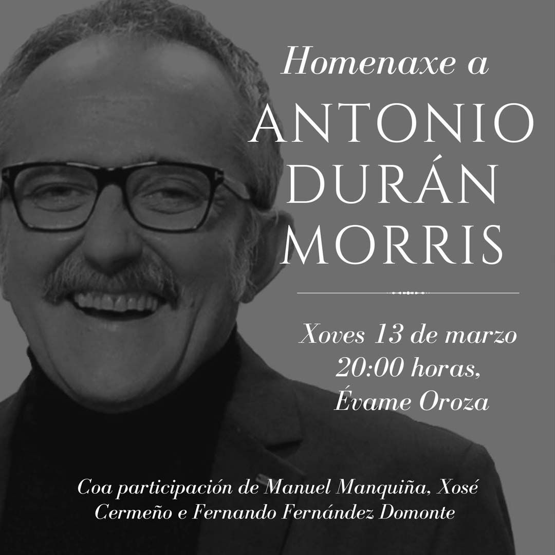 El jueves 13 de marzo (20:00 horas) la asociación hará un homenaje al actor vigués Antonio Durán Morris, en reconocimiento a toda su carrera y su papel fundamental en la historia cultural de la ciudad.