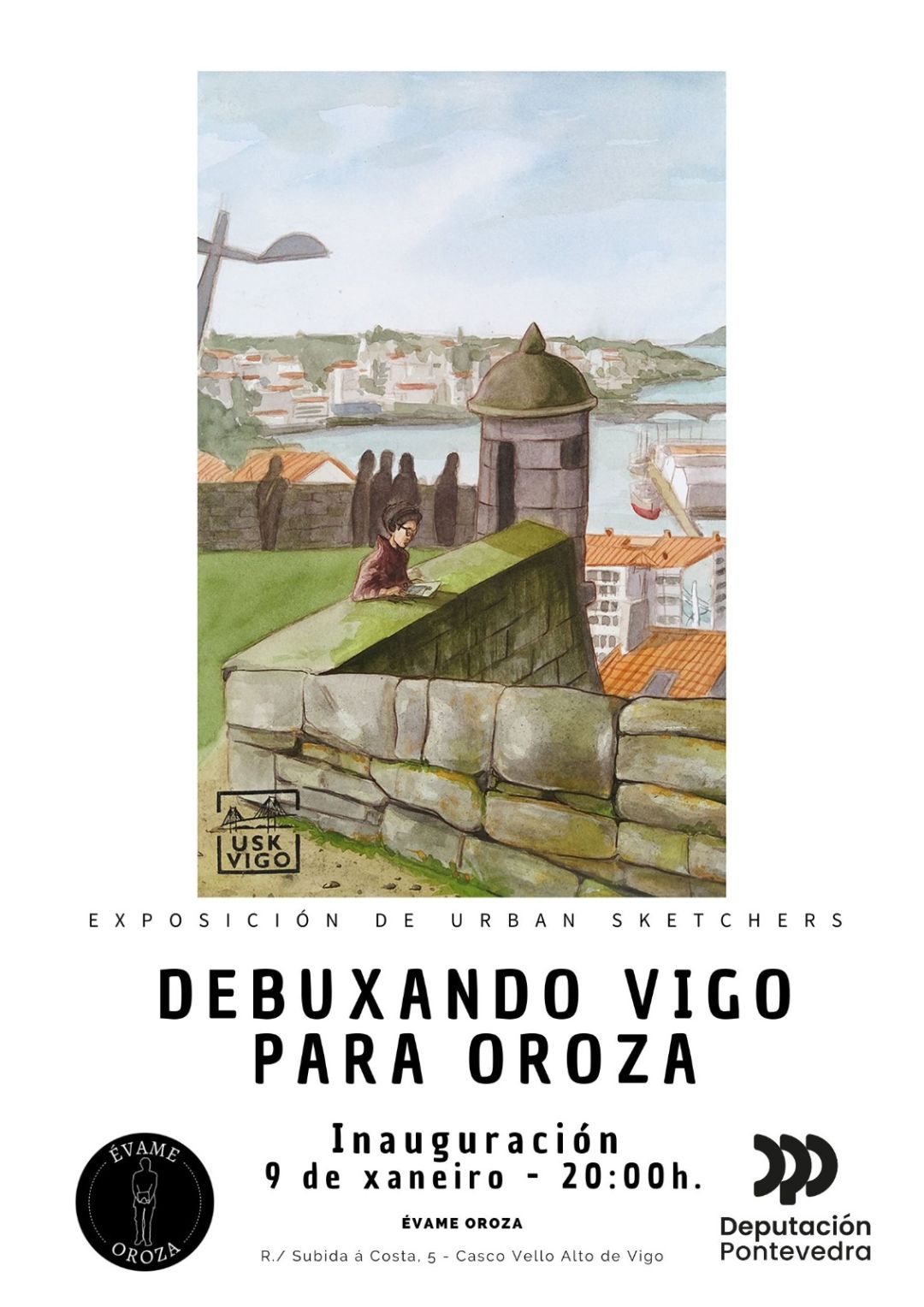 El viernes 9 de enero, a las 20:00 horas, se inaugura en el espacio cultural Évame Oroza la exposición Debuxando Vigo para Oroza, una muestra colectiva del grupo Urban Sketchers Vigo (USkVigo) que rinde homenaje al poeta Carlos Oroza a través del dibujo urbano. La exposición, que permanecerá en Évame Oroza hasta el 30 de enero, es el resultado de las dibujadas realizadas durante este otoño por más de 30 urban sketchers, que quisieron recordar la figura de Carlos Oroza. Para eso, escogieron enclaves emblemáticos de la ciudad, como el Paseo de Alfonso, el Monte deo Castro, la Porta do Sol, la Alameda, las Avenidas o el castillo de San Sebastián, espacios íntimamente ligados a la identidad viguesa.