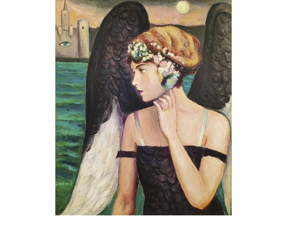 El misterio y el ángel - a Shuzo Takiguchi, 2023. Acrílico / lienzo, 70x60cm.