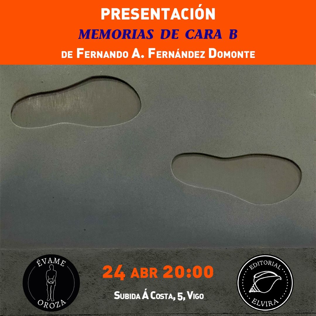 El jueves 24 de abril, a las 20:00 h. la Asociación Evame Oroza acogerá la presentación del libro «Memorias de Cara B» de Fernando A. Fernández Domonte. En el acto participarán el autor Fernández Domonte; el actor Manuel Manquiña; y el editor Xabier Romero. Entrada libre hasta completar aforo.