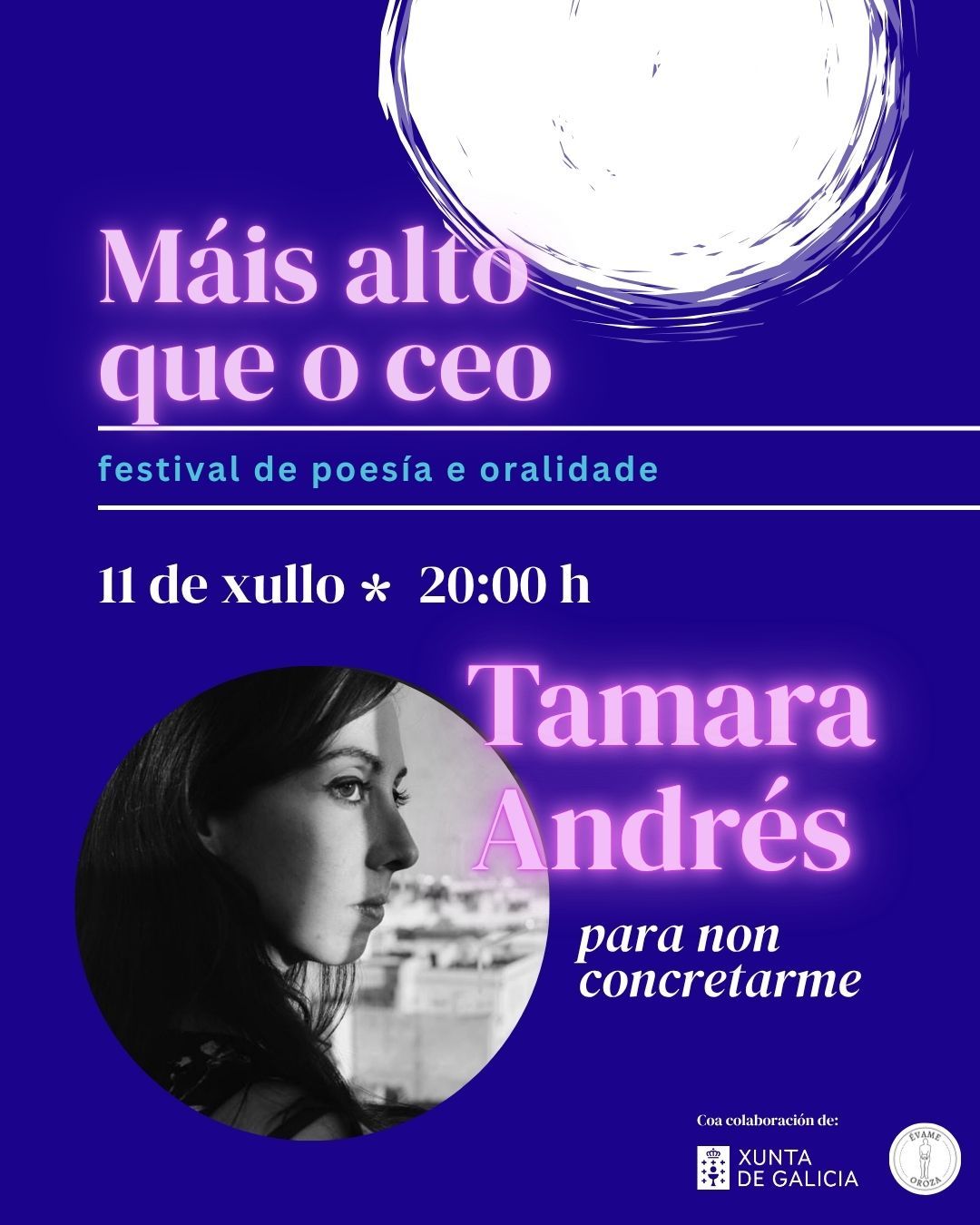 El viernes 11, a las 20:00 horas, se acercará a la asociación la poeta y traductora Tamara Andrés. Nos traerá la propuesta “Para non concretarme”, título que nos lleva hasta su último poemario, editado por Positivas, un libro en el que se puede apreciar la huella de la actividad traductora de Tamara en su obra.